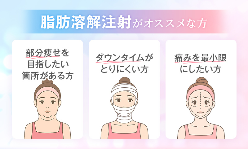脂肪溶解注射は、脂肪吸引のような大掛かりな手術とは違い、「日常生活を送りながら、切らずに、気になる箇所の部分痩せができる」のが最大の魅力です。